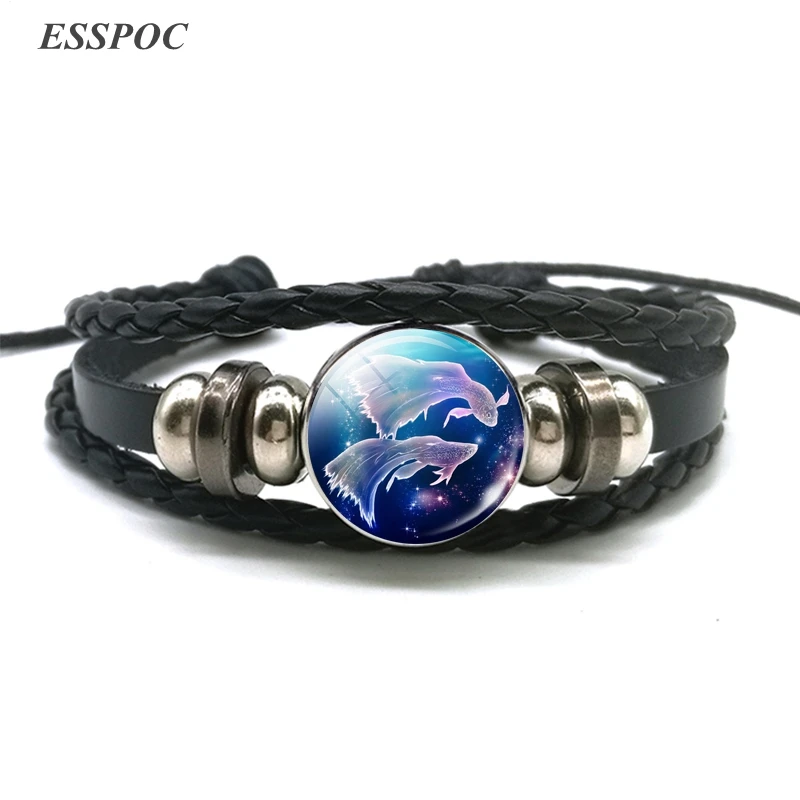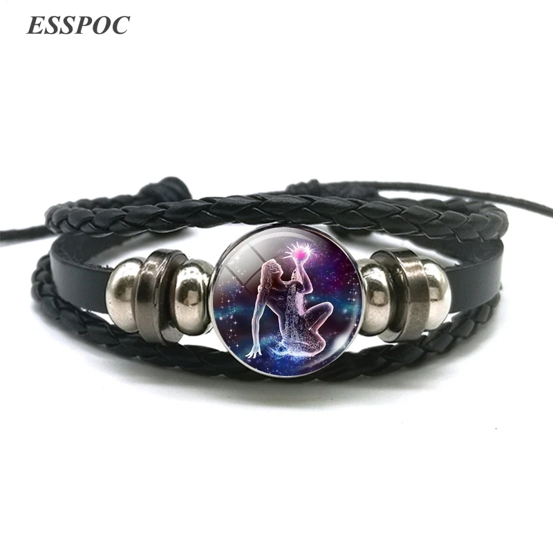 Best 12 Constellation Bracelet Charms Zodiac Sign Glass Cabochon Punk Jewelry Black Multilayer Leather B