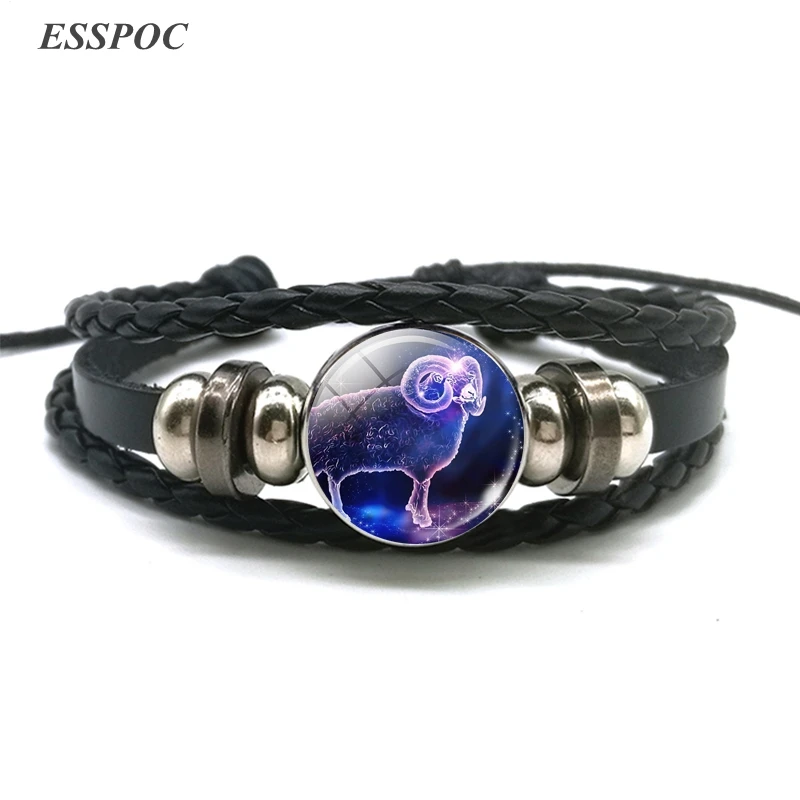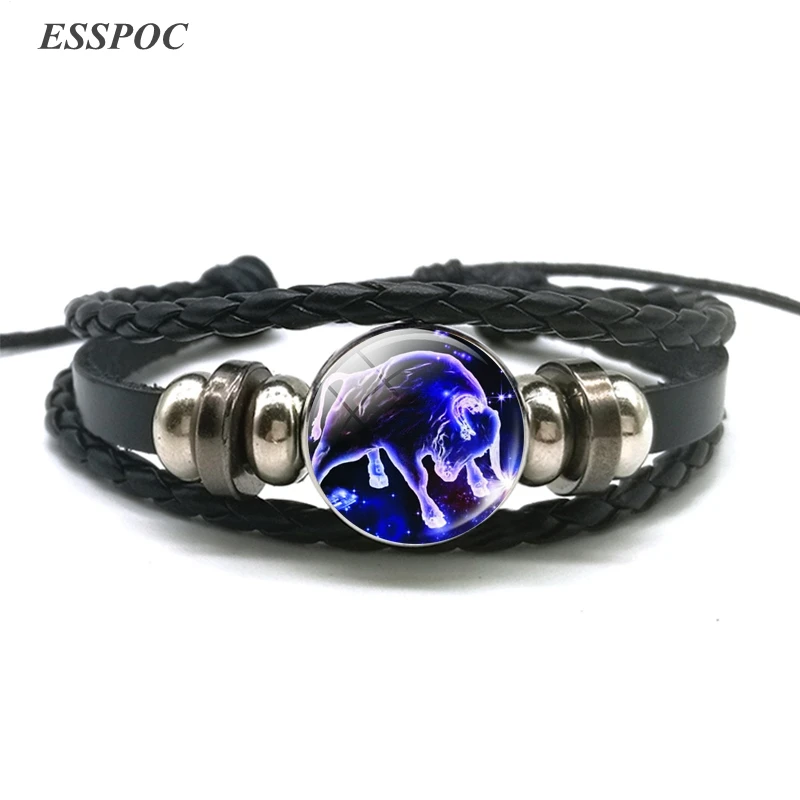 Buy 12 Constellation Bracelet Charms Zodiac Sign Glass Cabochon Punk Jewelry Black Multilayer Leather B